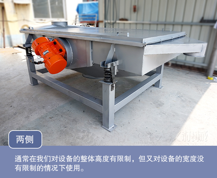 比如因?yàn)橐恍┪锪系奶厥庖螅O(shè)備的出料口不能離地太高啦,在這種情況我們?nèi)绻烧駝与姍C(jī)安裝在直線篩的底部或者頂部,那么設(shè)備的整體高度就不好控制了。一般來說直線篩的篩箱的高度通常是一定的,所以我們不能對篩箱的高度做調(diào)整,這是就可以考慮將振動電機(jī)安裝在直線篩的兩側(cè),這樣可以大大的降低設(shè)備的整體高度,又不影響設(shè)備的工作效率。