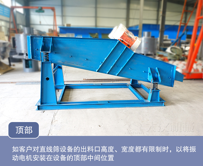 這種安裝方式在DZSF系列直線振動篩中是不常見,很少有人這么做,不過ZSG直線篩通常采用這種安裝方式,如客戶對直線篩設(shè)備的出料口高度、寬度都有限制,那么振動電機(jī)不論是安裝在底部仍是兩側(cè)都不能達(dá)到要求,這時就可以將振動電機(jī)安裝在設(shè)備的頂部中間位置,這樣既不增加設(shè)備的寬度,又不影響降低設(shè)備出料口的高度。