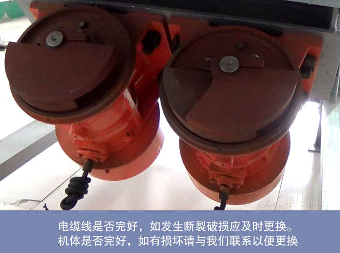 安裝就位后,在機(jī)體及基礎(chǔ)上,均要有電纜壓緊裝置,二者之間電纜呈自然懸吊狀,總長度以300-500mm為宜,自然懸垂部彎弧半徑參照 直線振動設(shè)備的兩臺振動電機(jī)同時工作時,應(yīng)檢查兩臺振動電機(jī)的轉(zhuǎn)向是否相反。否則應(yīng)變更一臺電機(jī)的電源相序,使兩臺振動電機(jī)的轉(zhuǎn)向相反,才能保證物料的均勻走向。
